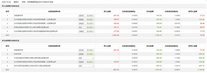 12月20日,弘业期货今日跌9.6%,全天换手率达5.23%,振幅达9.91%。龙虎榜数据显示,营业部席位合计净卖出992.69万元。其中,机构合计净卖出406.49万元。此外,深股通专用、中信证券鞍山胜利路证券营业部分别卖出416.29万元、364.48万元;深股通专用、东方财富证券拉萨团结路第二证券营业部分别买入487.53万元、199.97万元。