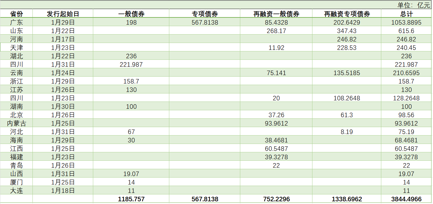 1月四川两次发行地方政府债,发行规模合计350.2518亿元。1月23日,四川发行再融资一般债券20亿元,再融资专项债券108.2648亿元,1月31日,发行新增一般债券221.987亿元。