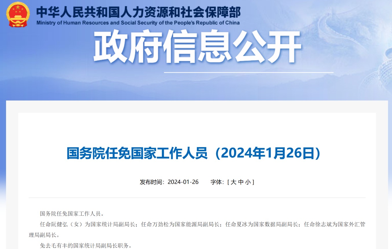 据人社部官网1月26日消息,国务院任免国家工作人员。