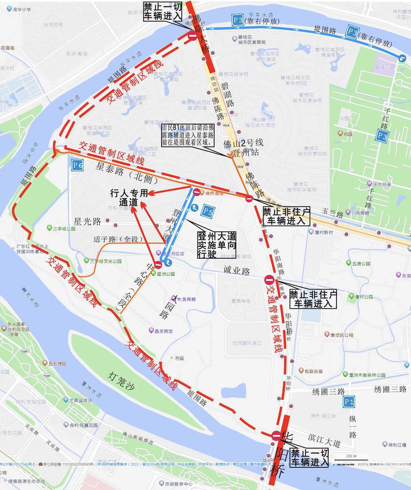 2、2月18日16时起至活动结束,华阳路登洲大道路口、华阳路诚业路口禁止非住户车辆进入管制区域(摩托车、电动车除外)。星泰路登洲大道路口东往西方向禁止车辆进入堤围路方向,北侧道路将用作行人专用通道前往观看区域;适子路登洲大道路口东往西方向禁止车辆进入堤围路方向,将用作行人专用通道前往观看区域;中心路诚业路路口北往南方向禁止车辆进入堤围路方向,车辆请往诚业路或登洲大道东侧段通行。